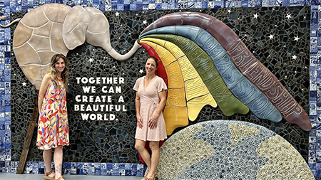 The kids brainstormed ideas for the theme of the mural, and the design is a compilation of ideas they came up with. They created all the border tiles, the land and water tiles for the Earth, and many of the outer space tiles. Dot and Heather created the large 3D pieces, glazed and fired all the work, and installed the mural.