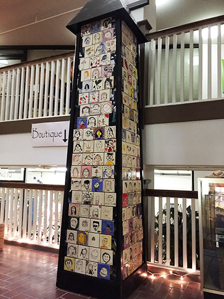 Prior to the pandemic, this piece had been started as a community project where visitors to Putnam's First Friday festivals were invited to paint a "self portrait" on a tile, using mostly black and white with just a splash of color. Some were more realistic, some were more abstract.
