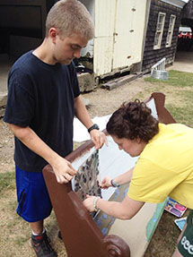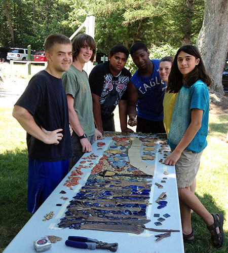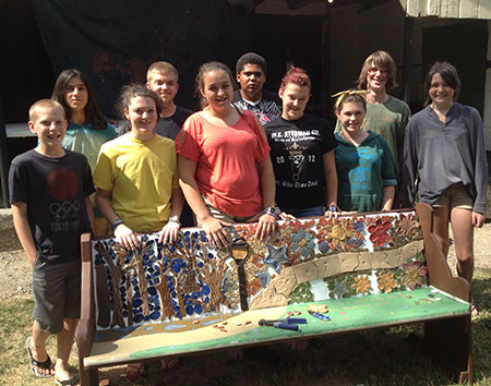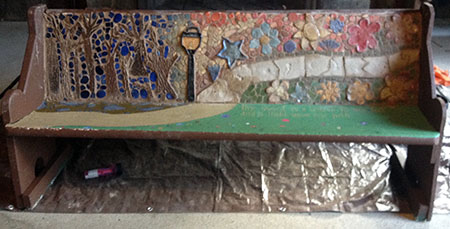 Light the Way was a project at the Episcopal Conference Center in Pascoag, RI. In one single week of camp, a group of students came up with a concept and design, created, glazed and fired the tiles, and installed them onto this bench that would sit outside the Tower of Silence. The piece served as a piece of art and a place of rest and contemplation.