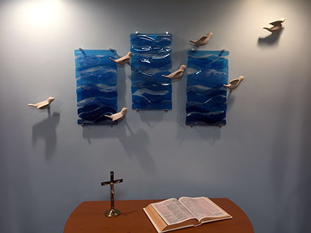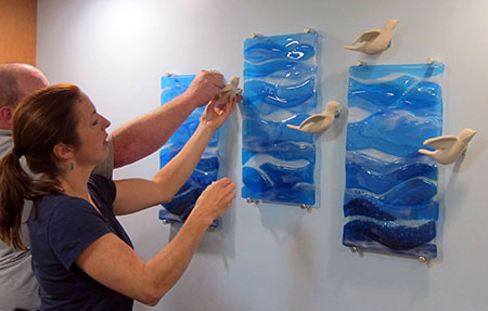 "Released" was a collaboration between Dot Burnworth and glass artist, Amy Jakowski. They were commissioned by Harrington Hospital to create an installation piece for the chapel. They worked together to design a piece that would evoke calm and hope for visitors to the chapel.